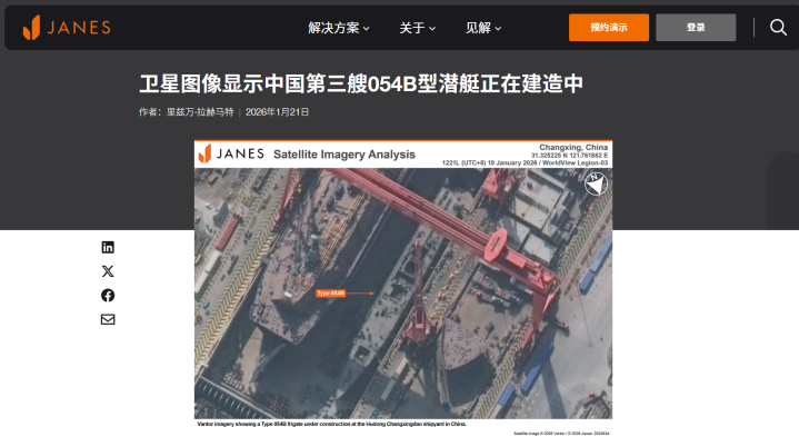 据简氏防务周刊网站1月21日报说念,在1月10日拍摄并开源的生意卫星相片中,一艘新式导弹护卫舰出咫尺上海沪东中华造船坞位于长兴岛新出产基地的干船坞内,傍边是一艘LNG液化自然侥幸送船的船体。