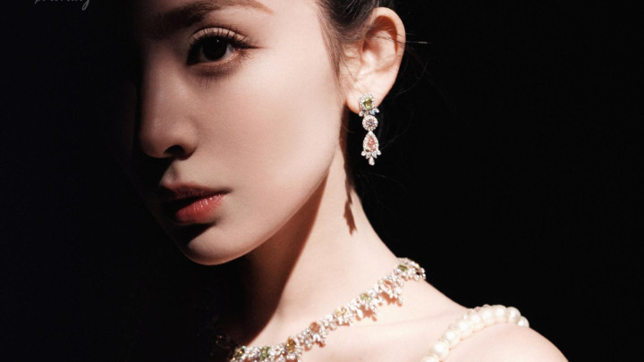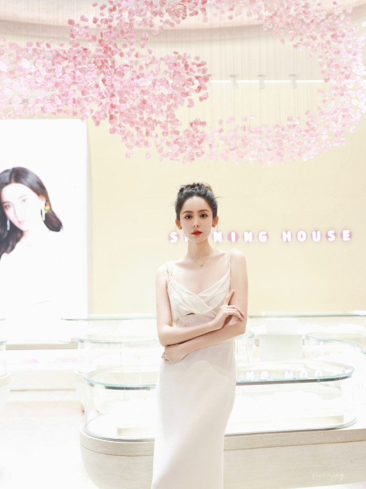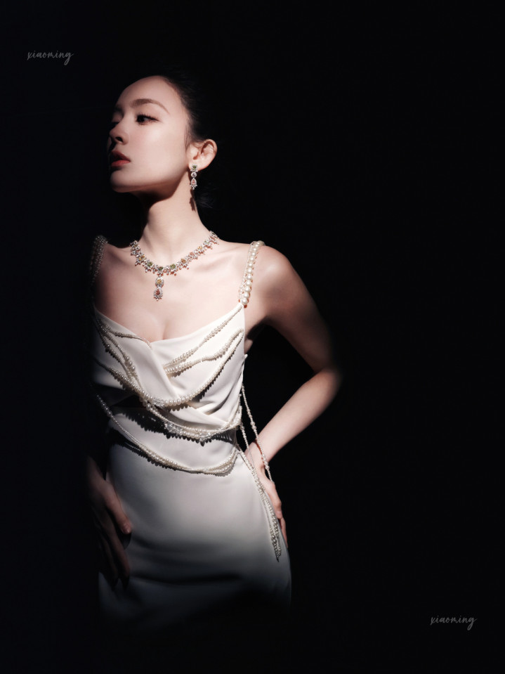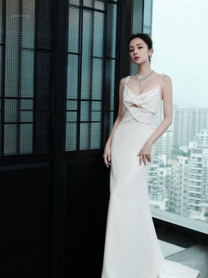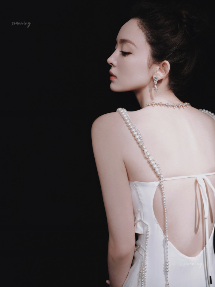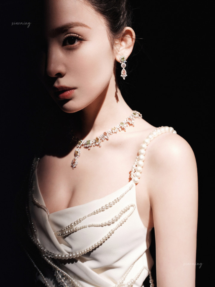 古力娜扎像蟾光揉进夜色,白裙流泻珍珠为链,眼波里全是致命虚心