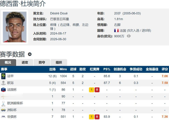 杜埃出自雷恩青训,球员于2024年夏窗以5000万欧元的转会费从雷恩加盟巴黎,合并溜会窗口姆巴佩免签加盟皇马。巴黎没了姆巴佩,杜埃赢得了重用,leyu上赛季皇马四大齐空,巴黎夺得六冠王,含队史首座大耳朵杯;本赛季皇马大要率亦然四大齐空的节拍,而巴黎要再一次冲击欧冠的冠军。杜埃上赛季54场15球14助,凭借着在巴黎出色的进展夺得了2025年金童奖。