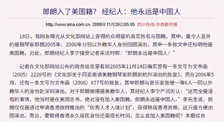 在08年文化部发布的明星姓名与国籍信息名单中,有网友发现郎朗是除外籍华东说念主的身份归国献艺,以至还有官方批文标注其为好意思国国籍。