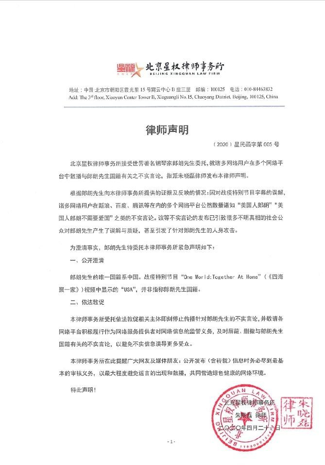 但这次争议并未握续,在郎朗方的严格声明并诉讼法律路线后,那些传播“郎朗国籍更换”的假话如丘而止,朗朗的皑皑从而得以讲明。
