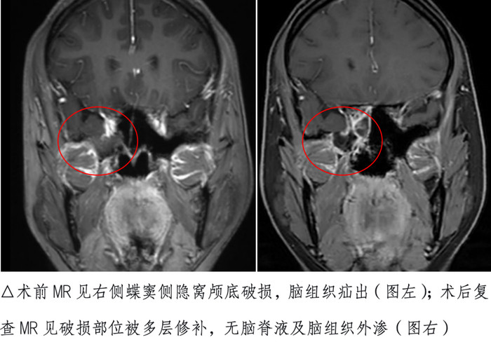 凭借丰富的鼻颅底手术教悔,邓泽义携带团队经鼻内镜微创入路,直达颅底蝶窦侧隐窝的缺损处,计帐疝出病变组织,取自体脂肪、筋膜等组织进行多层加固修补,全程躲闪遑急血管神经,精确完成漏口封堵。