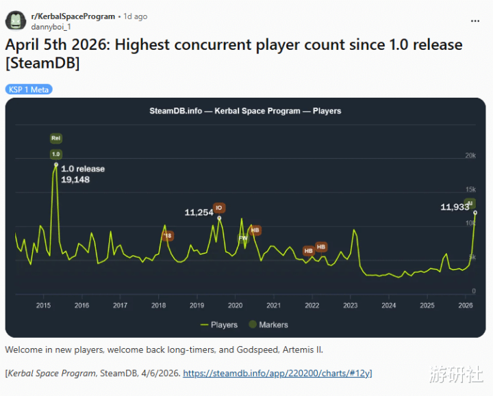 于2015年发售的天际沙盒模拟游戏《坎巴拉天际谋略》(KSP),就在“阿尔忒弥斯2号”任务技能迎来了一波玩家潮,Steam在线玩家峰值从浅近的3-4千东说念主激增至1.1万东说念主。