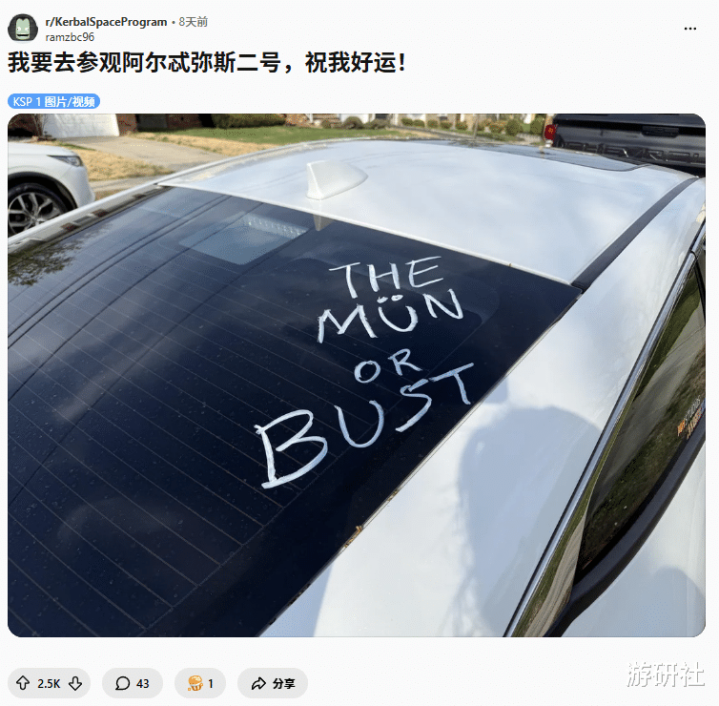 早在“阿尔忒弥斯2号”辐射前,就有粉丝独自驾车行驶了2176英里(约3502公里)的车程,参不雅辐射现场。在动身前,这位粉丝在车窗上写下了《坎巴拉天际谋略》的一句名言:“不到MUN毫不适度”,而MUN是游戏中的月球。