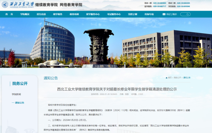 1月20日,西北工业大学延续教练学院官网发布一则《西北工业大学延续教练学院对于对超最长肆业年限学生作念学籍清退处理的公示》(以下简称“《公示》”)表示,字据《西北工业大学高档学历延续教练学生学籍处置笃定》(校教字〔2024〕112号)联系形态,经学院参谋决定,拟对300名超最长肆业年限学生作念学籍清退处理,乐鱼现给予公示。