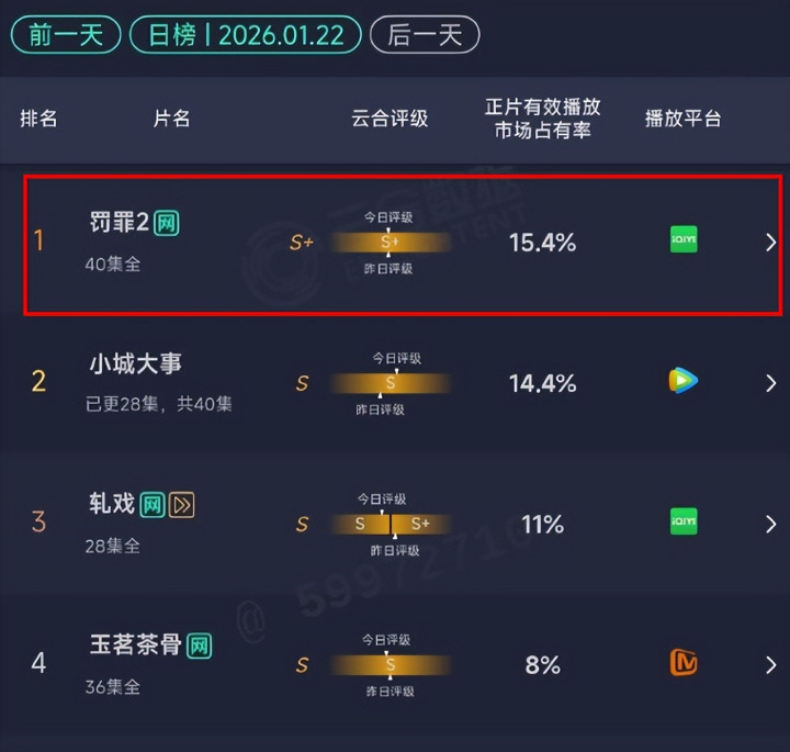 当今,《罚罪2》仍是大结局,关联词这部剧的云合正片有用播放市集占有率却高达15.4%,高于《小城大事》的14.4%,要知说念大结局之后,占比都会下落,但这部剧却相连多天依旧登顶。