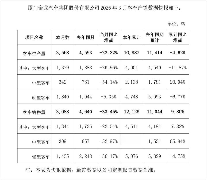 按照最新公布的一季度数据来看,宇通客车1-3月累计生产客车8429辆,同比着落5.65%;累计销售7652辆,同比着落了15.08%,3月单月的生产和销售数目也同比差异着落12.41%与15.79%。不外,这更多是因为高基数和行业总体的迁移影响。同业业金龙汽车的产销也出现了访佛变化。