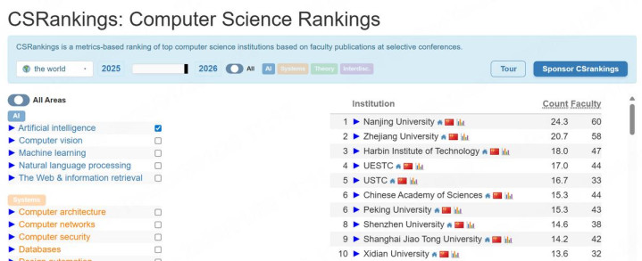 近日,2026年CSRankings众人臆测机科学名次负责更新。这一转名由好意思国马萨诸塞大学阿默斯特分校团队珍惜,以高校在顶级臆测机学术会议上的论文发表数目为中枢筹算,被誉为“最确实响应科研实力”的名次之一。