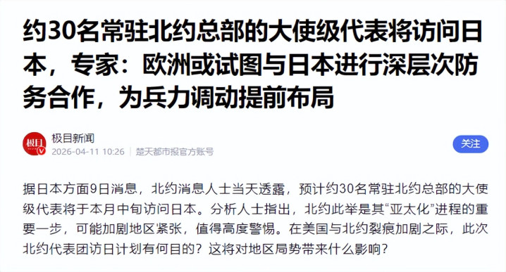 据aa.com.tr4月9日报谈,这次北约险些扫数成员国的大使王人将赶赴日本,这是北约初度派出如斯大规模的代表团看望日本,代表团还将与日本内阁大臣会谈,筹商“如何应答中俄”等议题,还会看望东京南部的横须贺好意思军基地。