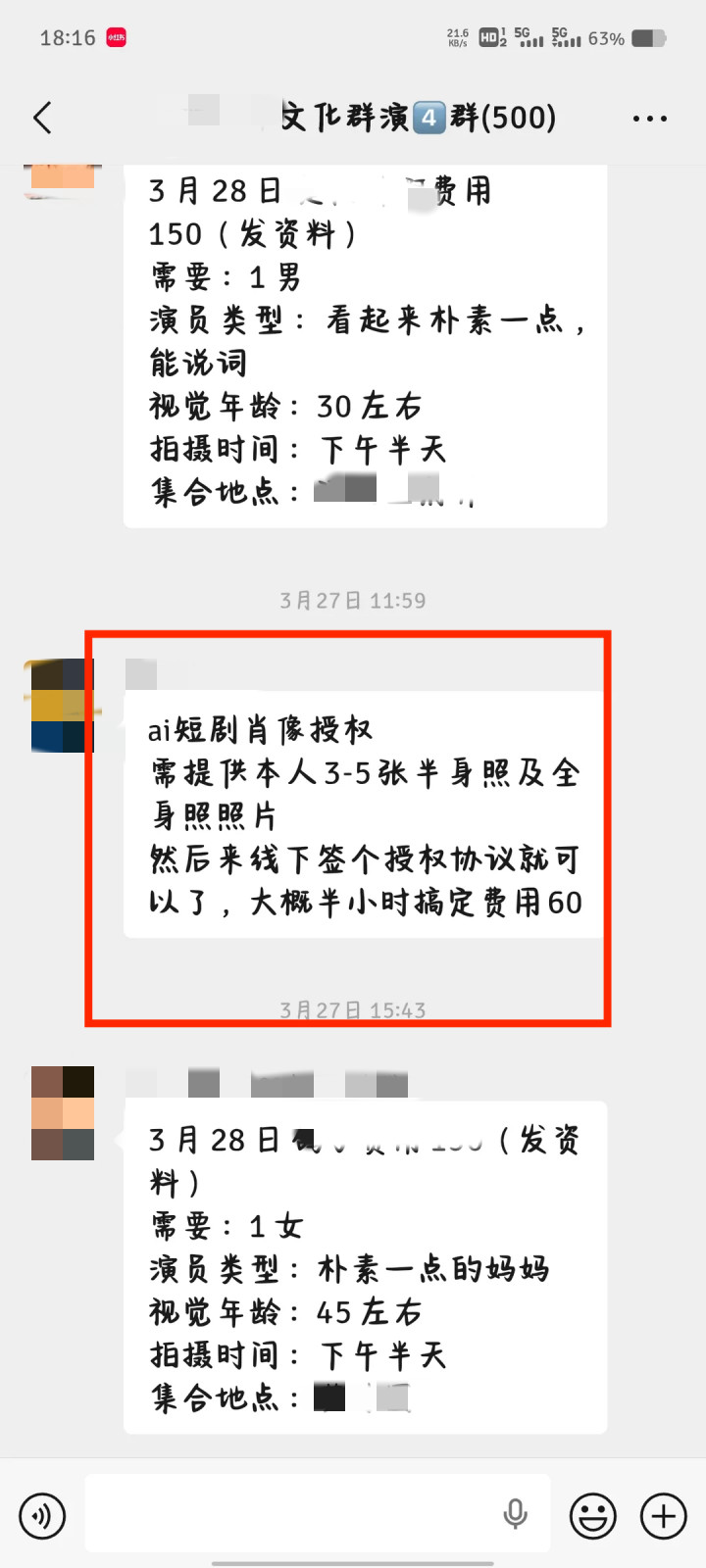 群演珂珂告诉新京报记者,群演群中依然出现60元的“AI短剧肖像授权”。受访者供图