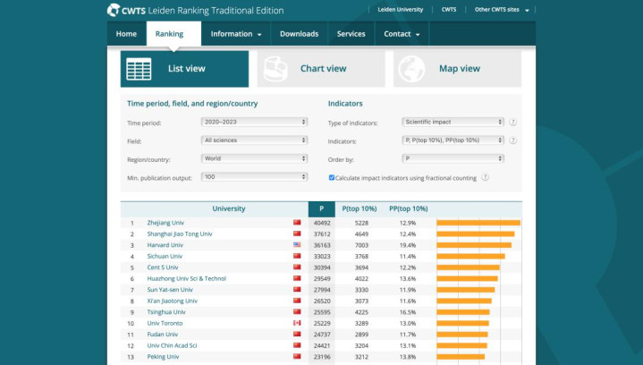 2025年版莱顿天下大学排行(传统版)。图/CWTSLeidenRanking官网