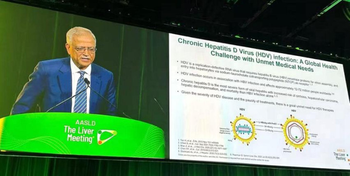 SaeedSadiqHamid栽植在2025年11月举行的好意思国肝病接头协会(AASLD)年会上先容立贝韦塔单抗的临床检会死心。华辉安健供图