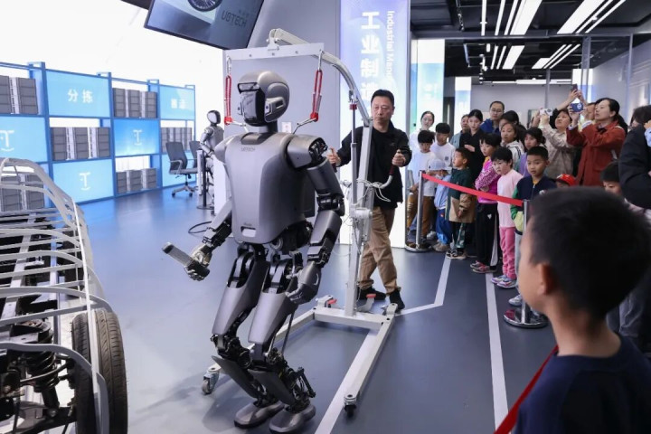 在北京机器东说念主产业园(亦庄)的北京“机器东说念主大世界”,参不雅者在不雅看工业机器东说念主检测无东说念主驾驶汽车轮胎的场景演示。陈晓根摄(影像中国)